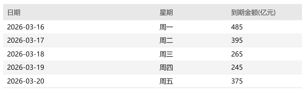 【下周央行公开市场将有1765亿元逆回购到期】财联社3月13日电,Wind数据显示,本周央行公开市场开展了1765亿元逆回购操作,因本周有2776亿元逆回购到期,本周实现净回笼1011亿元。此外,本周有1500亿元1个月期国库现金定存到期。下周央行公开市场将有1765亿元逆回购到期,其中下周一至下周五分别到期485亿元、395亿元、265亿元、245亿元、375亿元。此外,下周一将有6000亿元182天期买断式逆回购到期。