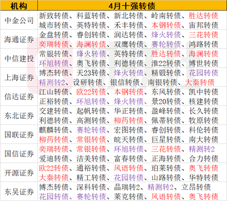 4月,多家券商推出了十强转债组合。据不完全统计,4月券商的十强转债名单中,有至少两家券商看好的标的包括:胜达转债、本钢转债、三花转债、奕瑞转债、海澜转债、烽火转债、赛轮转债、花园转债、大秦转债、欧22转债、环旭转债、柳药转债、常银转债、精测转2、风语转债和奥飞转债。其中,看好烽火转债、赛轮转债、环旭转债、花园转债和精测转2的券商超过了两家。