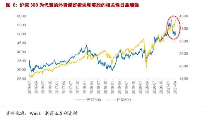具体来看,2014年沪港通开通,2016年深港通开通,近年来随着北上资金的持续流入,以沪深300为代表的外资偏好板块和美股的相关性日益增强。