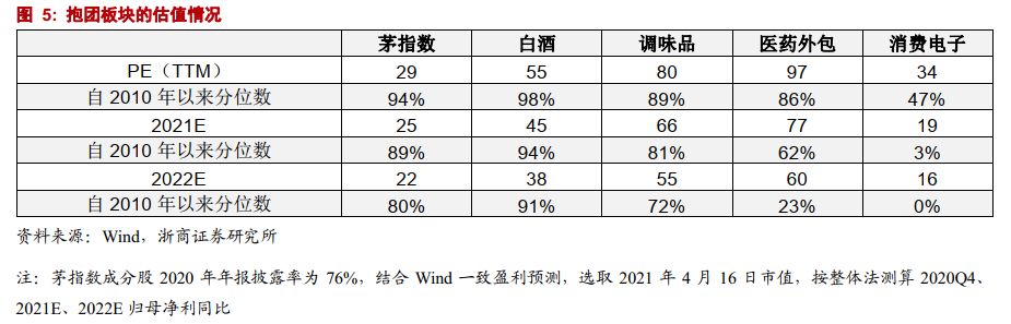 针对抱团股的代表性的白酒、调味品、医药外包和消费电子等,截至4月16日,PE-TTM分别为55倍、80倍、97倍、34倍,而2021年动态估值为45倍、66倍、77倍、19倍,自10年以来的分位数分别为94%、81%、62%、3%,而2022年动态估值的分位数进一步降至91%、72%、23%、0%。