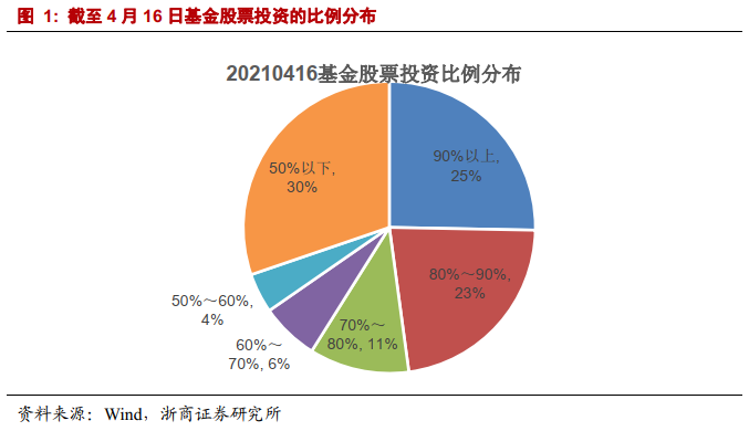 截至4月16日,基金的股票仓位已降至较低水平。根据Wind数据,针对股票型和混合型基金,约30%的股票仓位在50%以下。