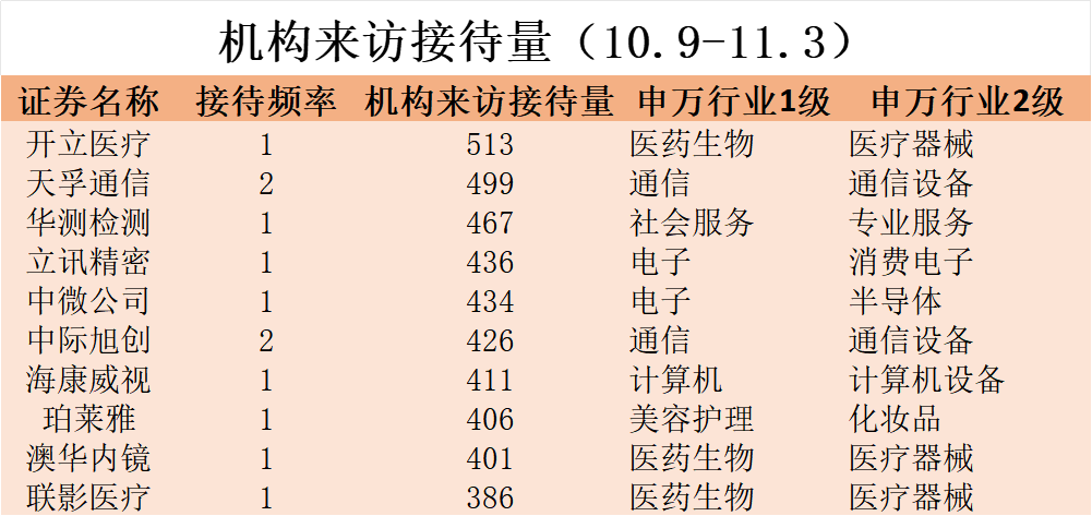11月4日讯(编辑 刘越)据Choice数据统计,截至11月3日收盘,沪深两市近一个月来共1300家上市公司接受机构调研。具体来看,接待机构调研次数位列前九的上市公司分别为冰轮环境、长安汽车、协创数据、华明装备、欧科亿、英力股份、鲍斯股份、广电运通、兴蓉环境,艾为电子、华曙高科和道通科技等公司并列第十,其中冰轮环境和长安汽车接受机构调研次数最多,均达到9次。从机构来访接待量统计,开立医疗、天孚通信、华测检测、立讯精密、中微公司、中际旭创、海康威视、珀莱雅、澳华内镜和联影医疗接待量位列前十,前三名开立医疗、天孚通信和华测检测来访机构接待量分别为513、499和467家。