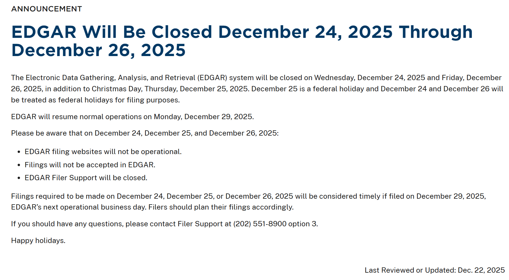 在周一的公告中,SEC宣布电子数据收集、分析与检索(EDGAR)将于24日和26日关闭,再加上25日原本就是假期,所以系统要到下周一(12月29日)才能恢复正常运行。因此,在24-26日这三天里,EDGAR申报网站将无法使用,也不接受任何申报文件,同时支持服务也将暂停。