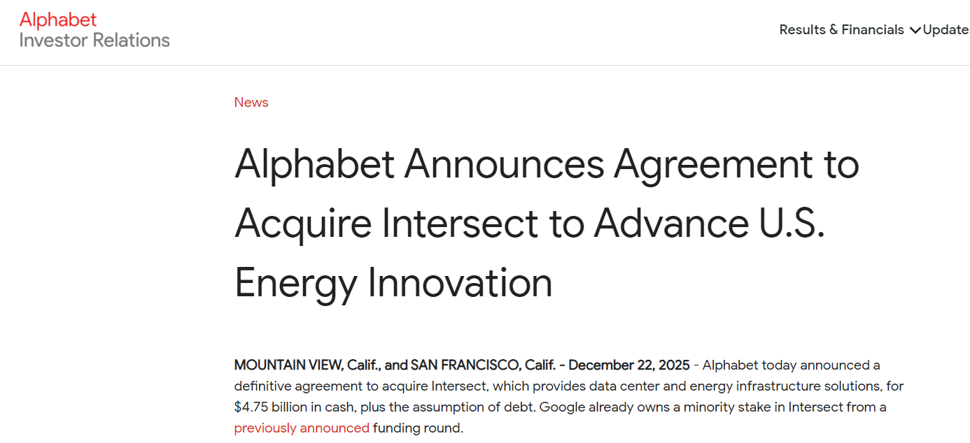 12月23日讯(编辑 牛占林)当地时间周一,谷歌母公司Alphabet宣布,已达成一项最终协议,将以47.5亿美元现金收购数据中心和能源基础设施公司Intersect,并同时承担其相关债务。