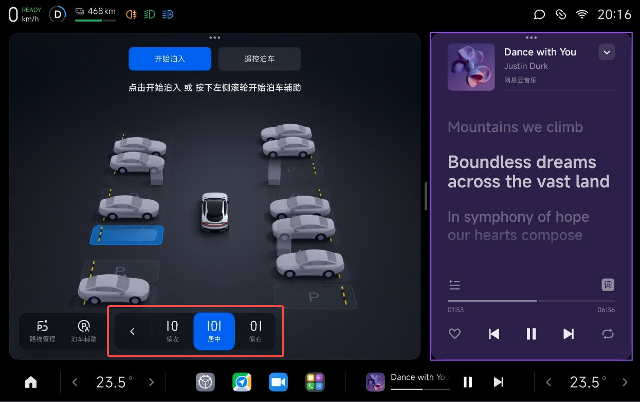 「泊车偏移辅助」功能目前主要适用于垂直车位和斜列式车位,暂不支持水平侧方车位和机械车位。我们也温馨提示您,由于周围环境和车位尺寸不同,启用「泊车偏移辅助」时可能会出现适当压线的情况。此外,如果车位旁障碍物距离太近,偏移效果可能会受限,请您理解。