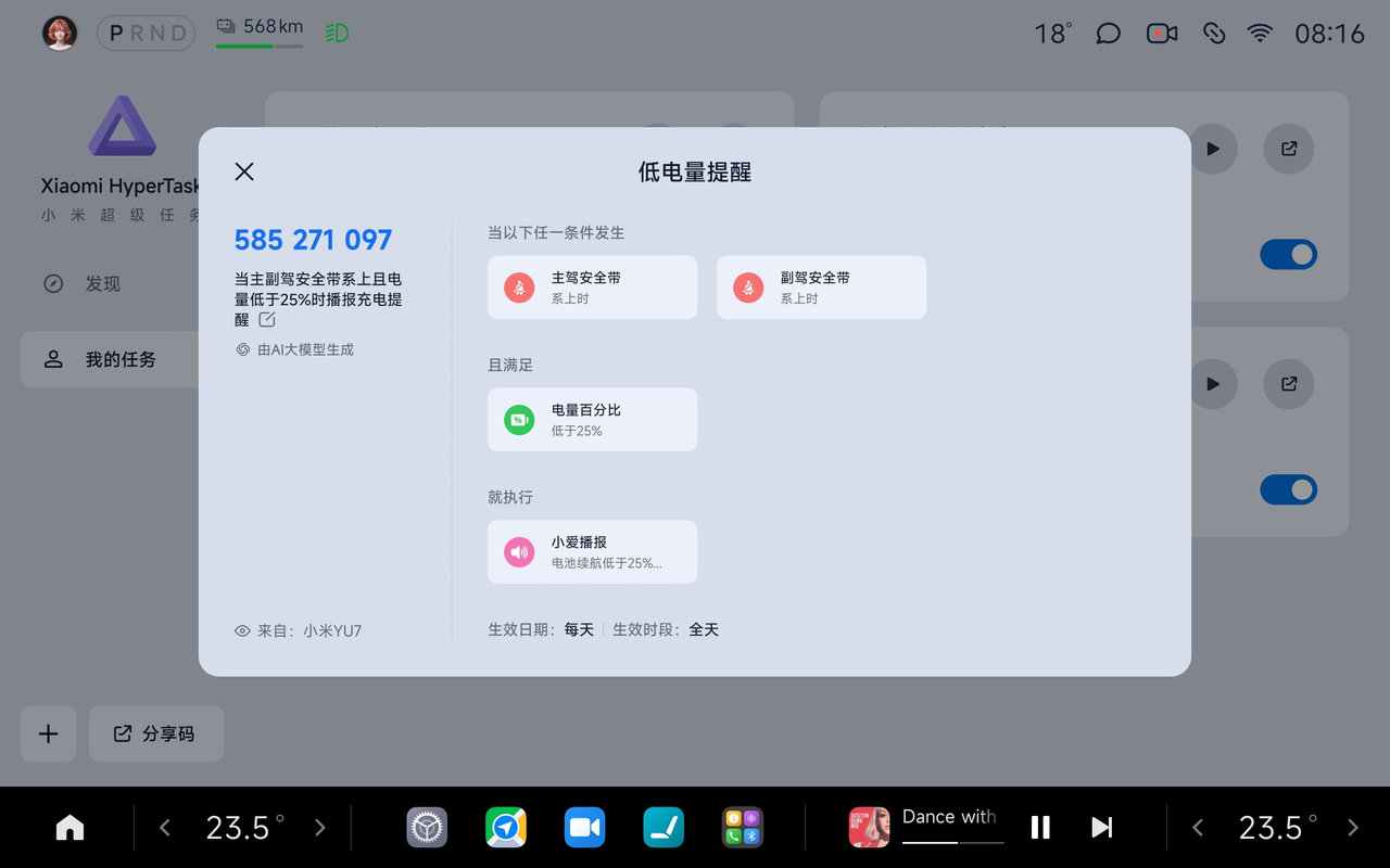 小米超级任务的分享功能非常酷炫且便捷:在创建或编辑完一个任务后,点击「分享」按钮。系统会通过AI大模型自动生成一个任务描述,并生成一个9位数的分享码。其他车主用车机端的小米超级任务应用里输入这个分享码,即可收到这个编写好的任务,且能够看到这段由AI生成的摘要和任务配置,一键即可导入使用,无需再次自己手动配置。(请注意,若任务中涉及生态件或者米家设备,可能需要您自行手动选择)