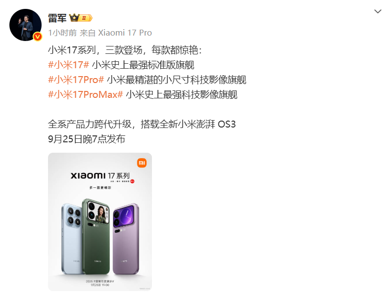 9月22日讯,小米董事长兼CEO雷军在微博发文称,小米17系列将于9月25日晚7点正式发布,该系列包括小米17、小米17Pro、小米17Pro Max三款机型。