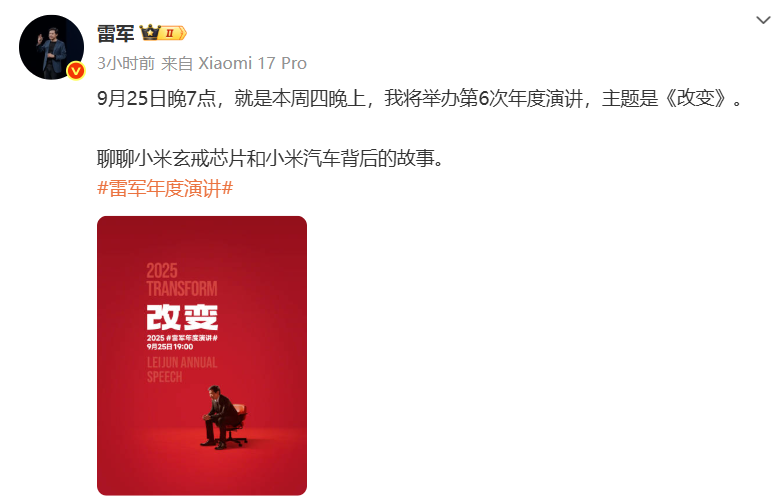 小米17定档9月25日发布,雷军当晚举行《改变》演讲