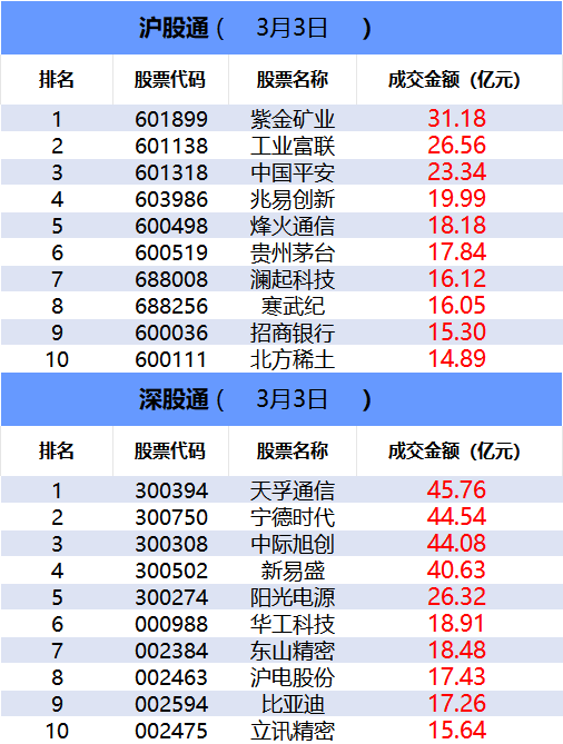 从沪股通前十大成交个股来看,紫金矿业位居首位;工业富联和中国平安分居二、三位。