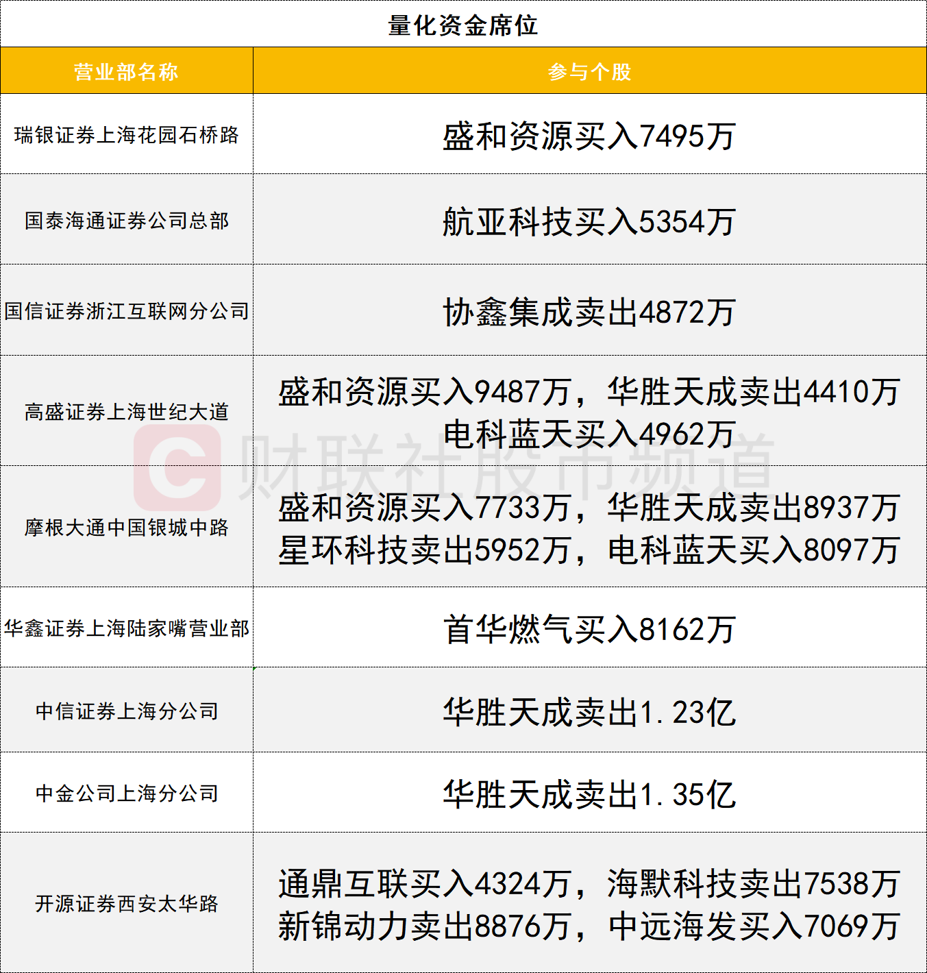 量化资金活跃度一般,华胜天成触及跌停,遭四家量化(中金公司上海分公司、中信证券上海分公司、摩根大通中国银城中路、高盛证券上海世纪大道)合计卖出3.91亿。