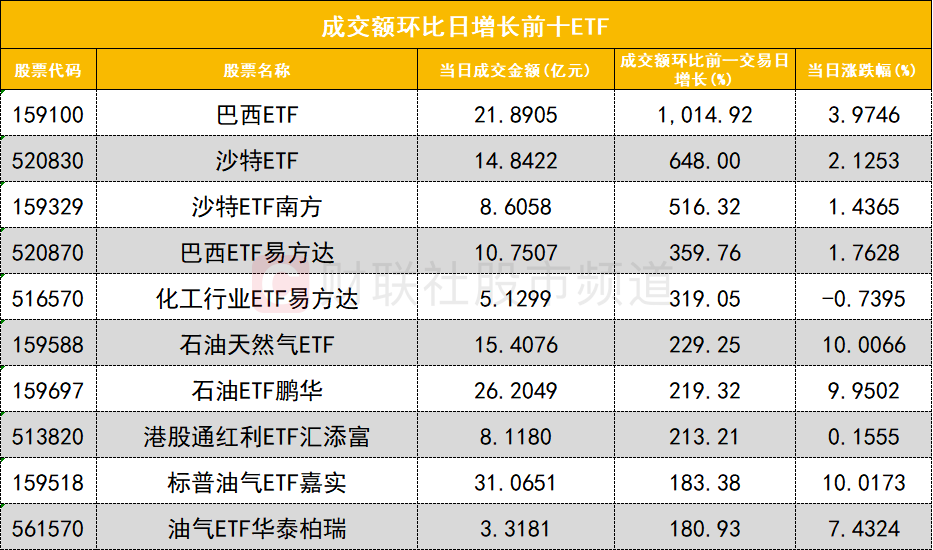 从成交额环比增长前十的ETF来看,巴西ETF(159100)成交额环比增长1014%位居首位;沙特ETF(520830)成交额环比增长648%位居次席。