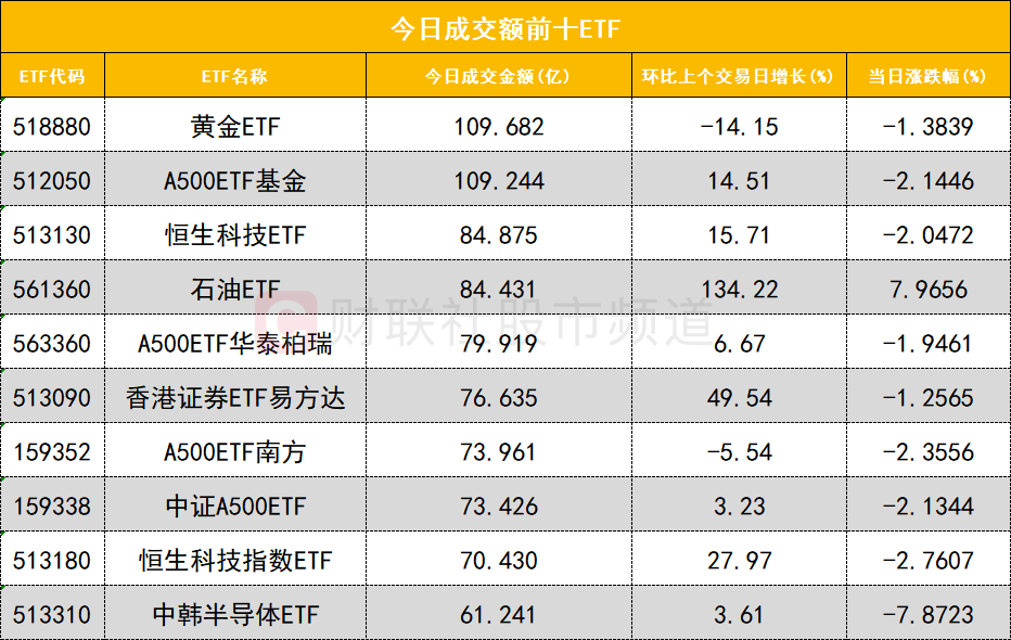 从成交额前十的ETF来看,黄金ETF(518880)成交额位居首位,A500ETF基金(512050)成交额位居次席。