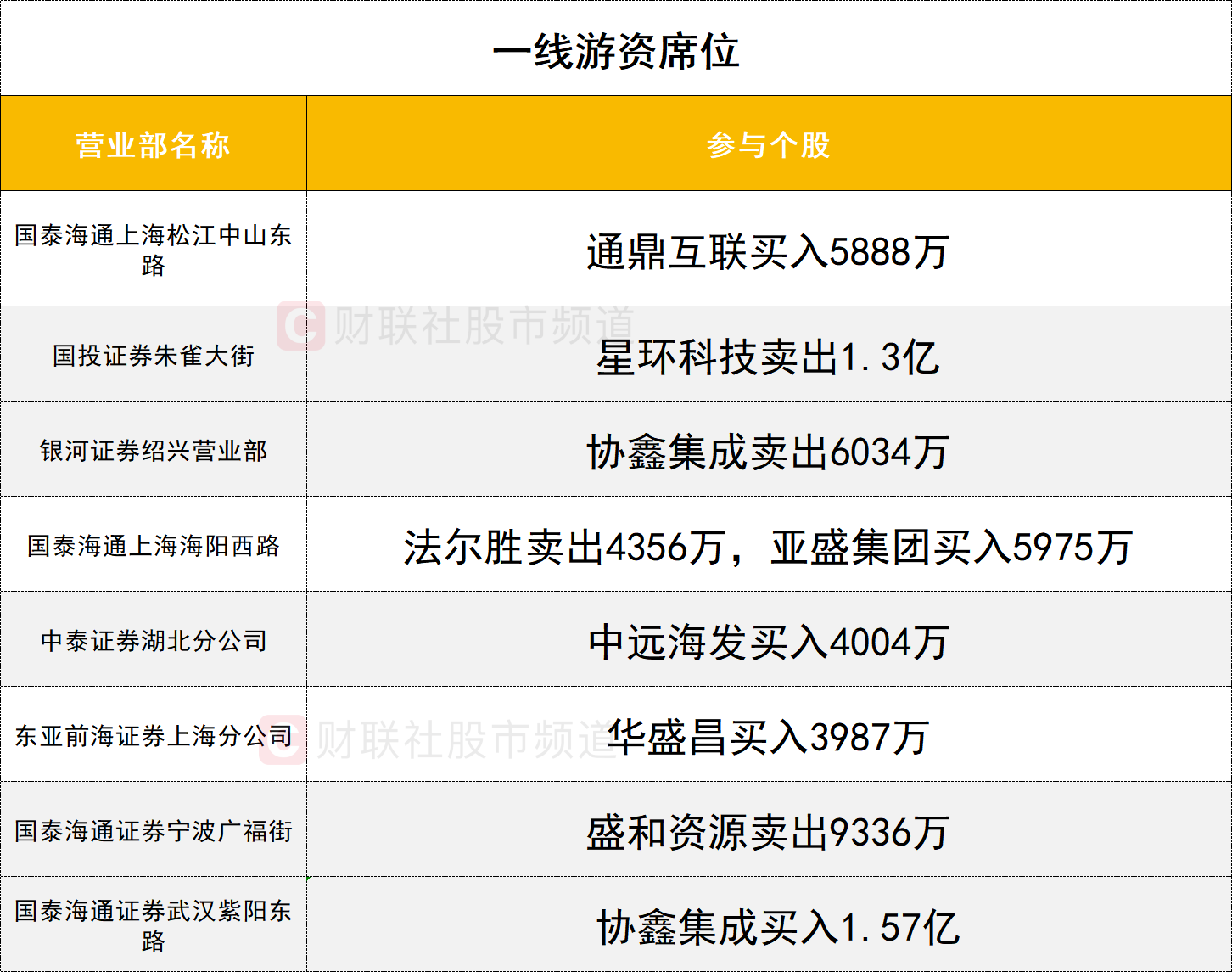 一线游资活跃度有所降低,协鑫集成逆势涨停,获一家一线游资(国泰海通证券武汉紫阳东路)买入1.57亿,同时遭一家一线游资(中国银河证券绍兴营业部)卖出0.6亿。