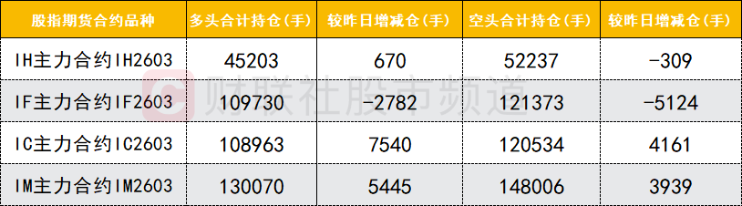 四大期指主力合约中,IC、IM合约多空双方均加仓,并且多头加仓数量较多。IF合约多空双方均减仓。