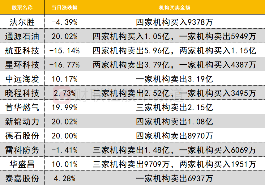 龙虎榜方面,油气股逆势爆发,通源石油20CM两连板,获四家机构买入1.05亿,同时遭一家机构卖出0.59亿;首华燃气今日涨停,遭三家机构卖出2.15亿;新锦动力也走出20CM两连板,却遭四家机构卖出1.08亿。黄金概念股晓程科技今日冲高回落,深股通买入2.89亿。