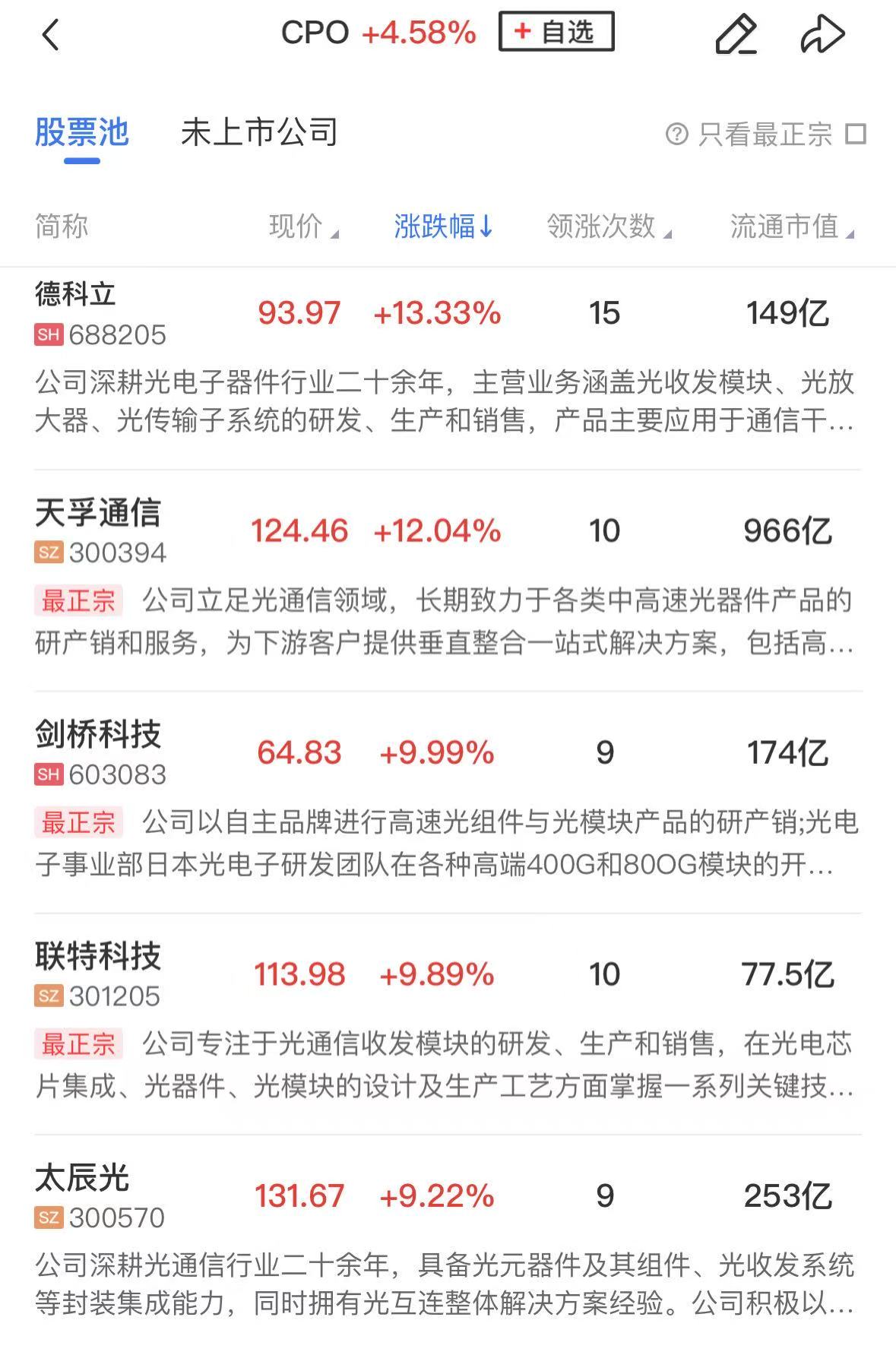 CPO等算力硬件股维持强势,意华股份、剑桥科技涨停,强瑞技术、兆龙互连、德科立、天孚通信涨超10%,太辰光、联特科技、东田微等涨幅居前。