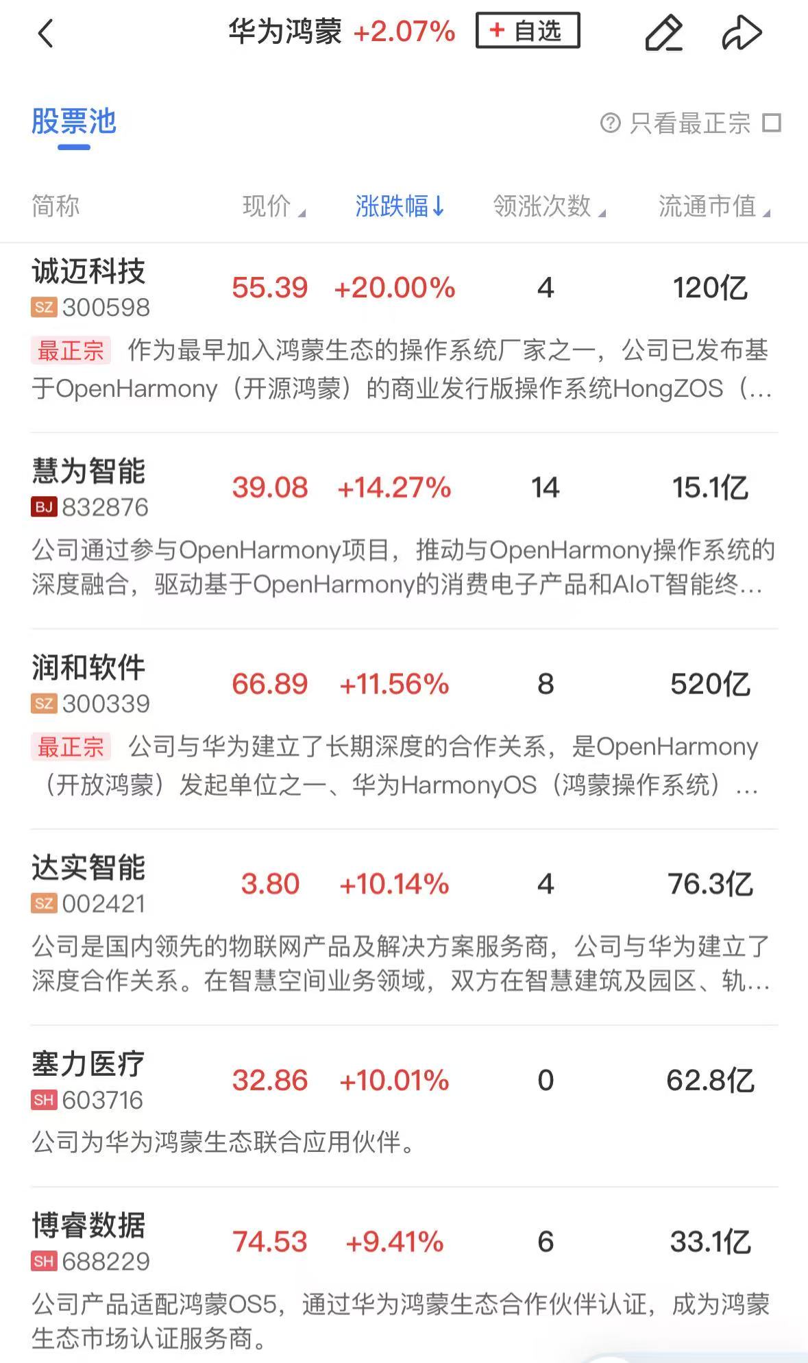 板块上,华为概念股震荡走强,诚迈科技、四川长虹、意华股份涨停,慧为智能、润和软件、高新兴、税友股份、常山北明涨幅居前。消息面上,8月16日,央视《对话》聚焦鸿蒙生态的最新进展,华为常务董事、终端BG董事长余承东首先披露了鸿蒙最新进展,目前,鸿蒙5.0终端数量已突破一千万。这标志着,鸿蒙操作系统生态迈过关键门槛。