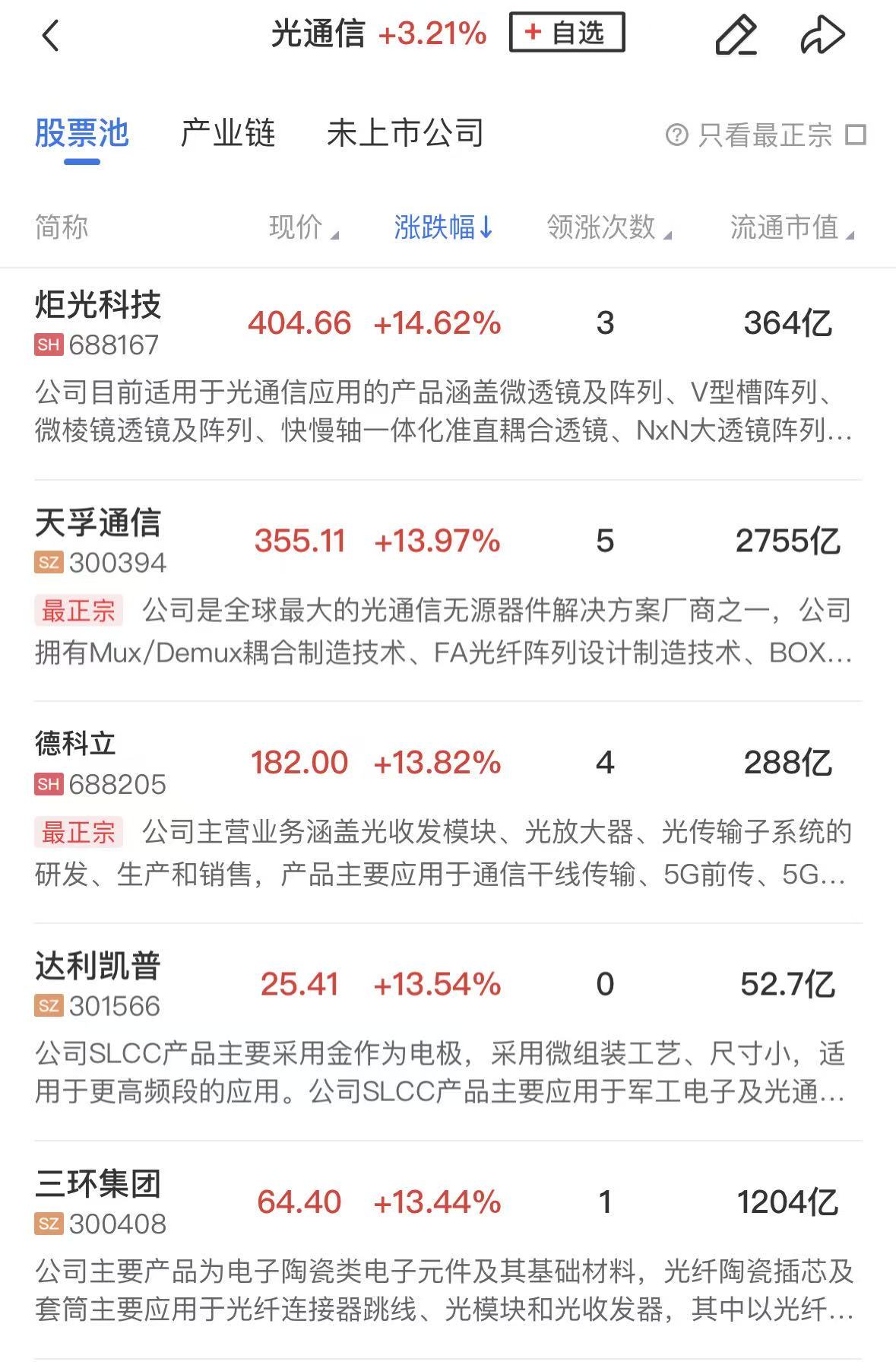 光通信概念再度走强,昀冢科技、长飞光纤、长江通信、华脉科技、亨通光电、法尔胜等个股涨停,炬光科技、天孚通信、德科立等涨超10%。