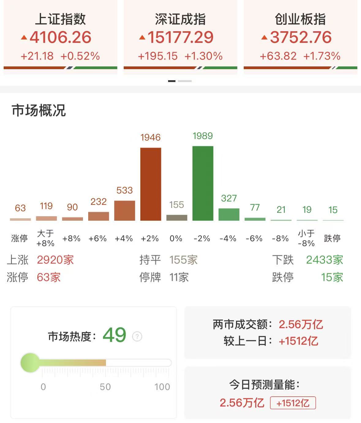 4月22日讯,市场低开高走,沪指重返4100点,创业板指、深成指均涨超1%。创业板综指创历史新高,突破2015年6月3日的高点。沪深两市成交额2.56万亿,较上一个交易日放量1512亿。盘面上,市场热点快速轮动,全市场超2900只个股上涨。从板块来看,算力硬件方向全线拉升,东山精密、长光华芯涨停创历史新高,工业富联触及涨停,权重新易盛、中际旭创均创历史新高。光纤概念反复活跃,永鼎股份涨停,续创历史新高,杭电股份封涨停。算力租赁概念持续走强,协创数据触及20CM涨停,宏景科技涨超15%,双双创历史新高,杭钢股份封涨停。下跌方面,影视院线概念集体调整,光线传媒、博纳影业、幸福蓝海纷纷下挫。截至收盘,沪指涨0.52%,深成指涨1.3%,创业板指涨1.73%。