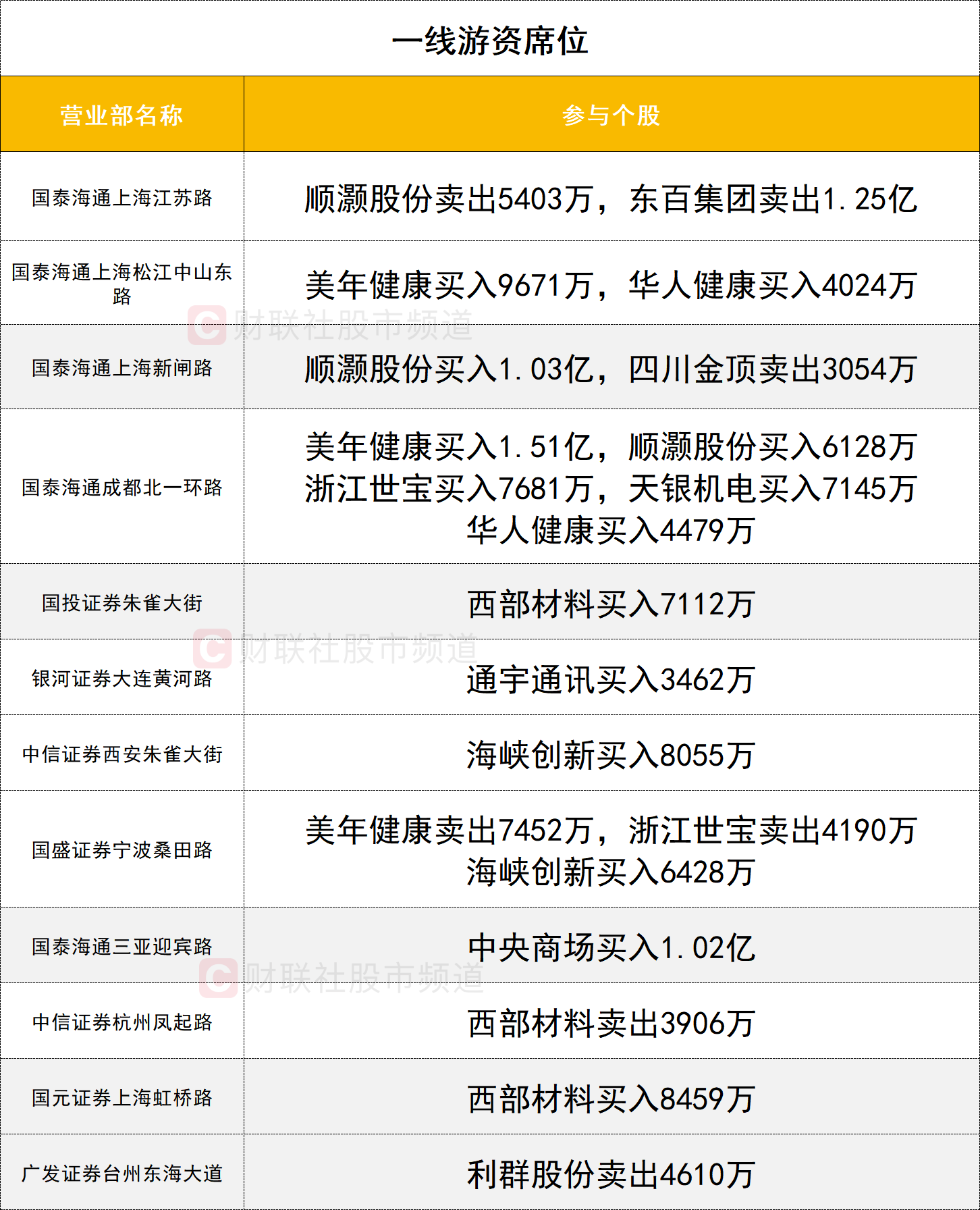龙虎榜方面,商业航天概念股顺灏股份今日涨停,获两家一线游资(国泰海通证券上海新闸路、国泰海通证券成都北一环路)合计买入1.64亿,一家一线游资(国泰海通证券上海江苏路)卖出0.54亿。美年健康晋级2连板,获一家机构买入6866万,同时获深股通买入8311万,两家一线游资(国泰海通证券成都北一环路、国泰海通证券上海中山东路)合计买入2.47亿。