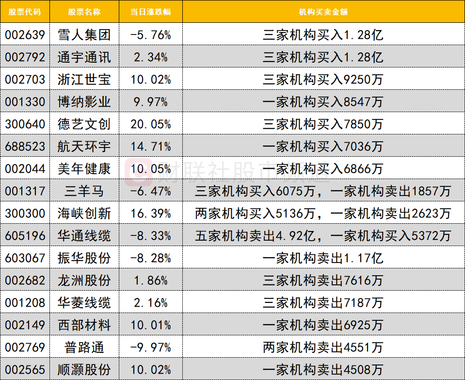 今日龙虎榜机构活跃度较高,买入方面,美年健康获一家机构买入6866万,同时获深股通买入8311万。雪人集团获三家机构买入1.28亿。智能驾驶概念股浙江世宝三家机构买入9250万。