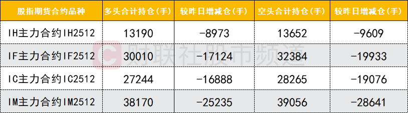 四大期指主力合约中,IH、IF、IC、IM合约多空双方均减仓,IM、IC合约空头减仓数量较多。