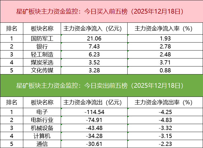 从主力板块资金监控数据来看,国防军工板块主力资金净流入居首。