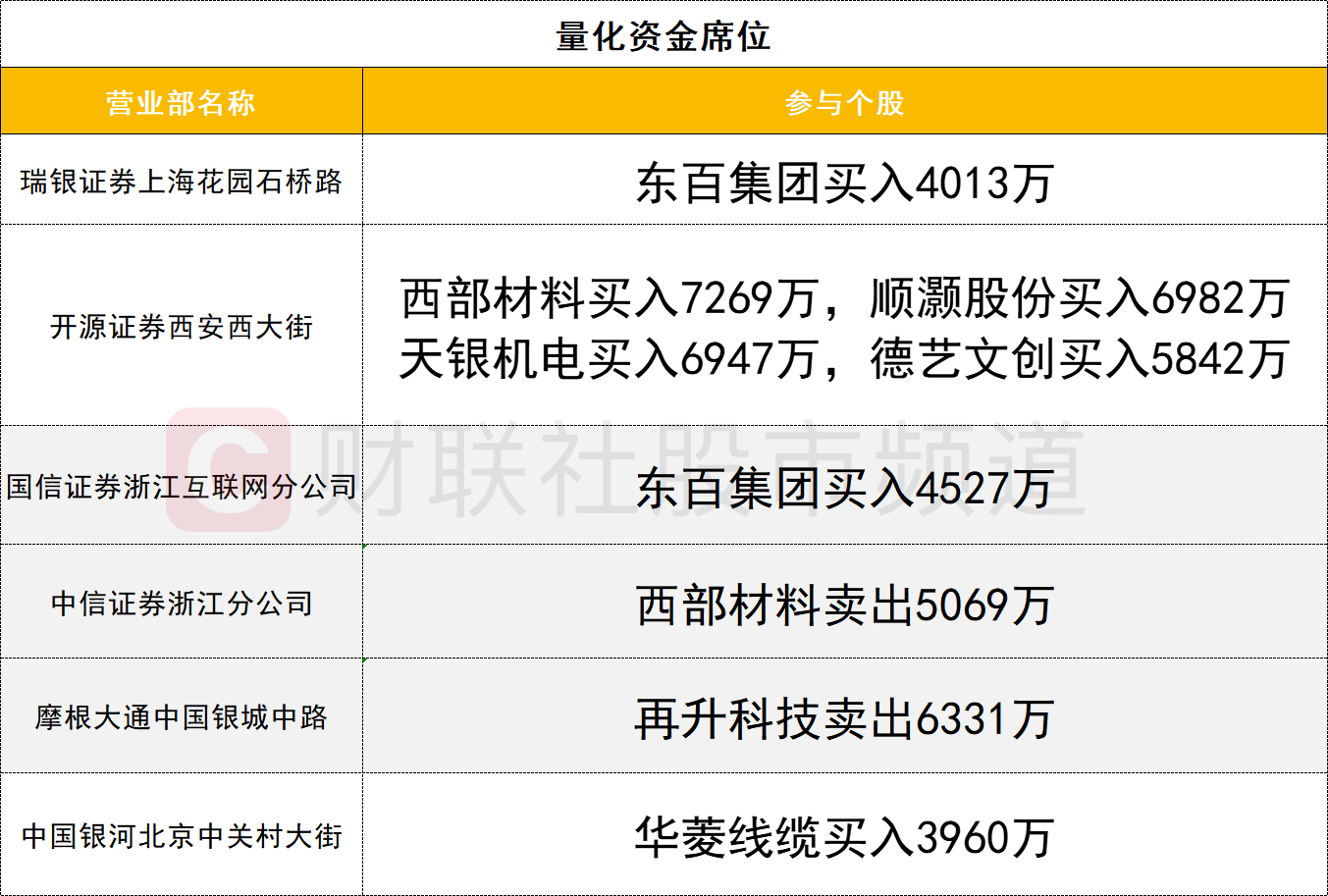 量化资金活跃度明显降低,西部材料获开源证券西安西大街营业部买入7269万,遭中信证券浙江分公司卖出5069万。