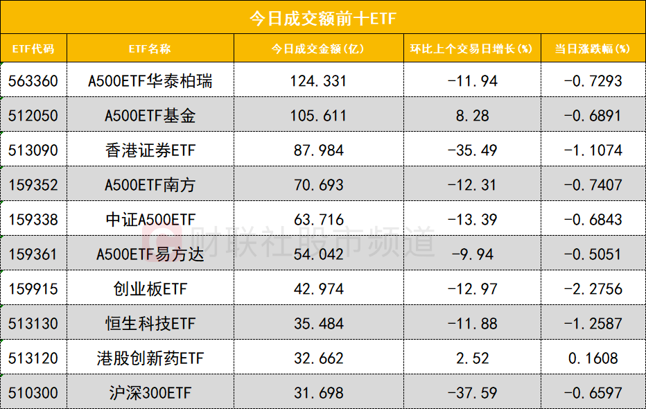 从成交额前十的ETF来看,A500ETF华泰柏瑞(563360)成交额位居首位,A500ETF基金(512050)成交额位居次席。