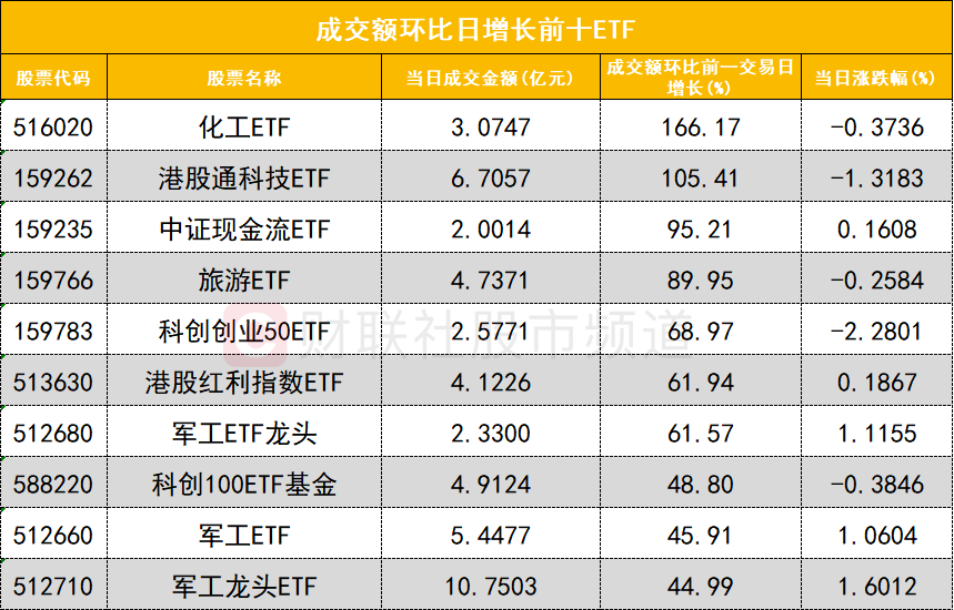 从成交额环比增长前十的ETF来看,化工ETF(516020)成交额环比增长166%位居首位;港股通科技ETF(159262)成交额环比增长105%位居次席。