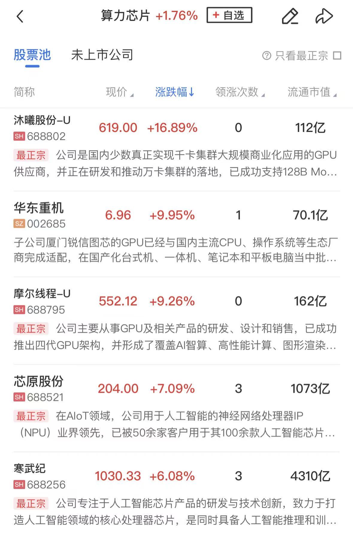 算力芯片概念反弹,沐曦股份涨超15%,摩尔线程涨超9%,芯原股份、寒武纪、金海通、灿芯股份等跟涨。