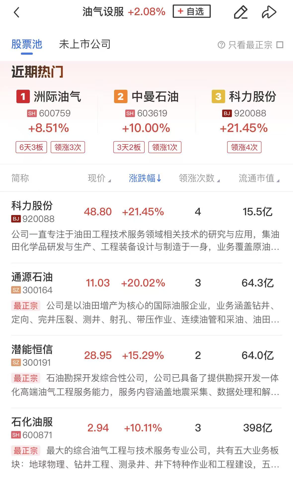 油气股同样走强,中国海油涨超7%续创历史新高,通源石油、石化油服、中曼石油、准油股份等个股涨停,潜能恒信、洲际油气、中油工程等个股涨幅居前。