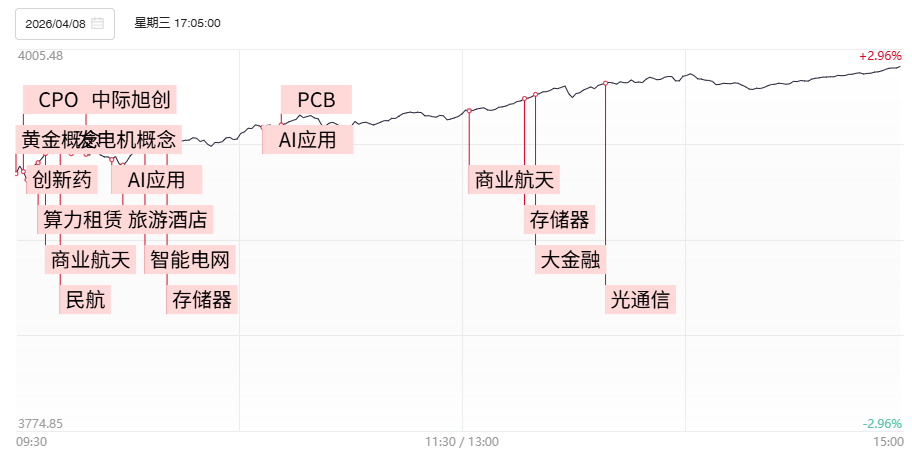 4月8日讯,今日123股涨停,17股炸板,封板率为88%,汇源通信4连板,中安科3连板,美诺华13天7板,新中港6天5板,神剑股份9天5板,中工国际4天3板,九州一轨20cm 3天2板。市场集体反弹,沪指百点长阳,创业板指涨近6%、科创50指数涨超6%。量能明显放大,沪深两市成交额2.43万亿,较上一个交易日放量8201亿。盘面上,市场热点快速轮动,全市场超5100只个股上涨,连续两日超百股涨停。板块方面,贵金属、AI应用、算力租赁、算力硬件方向领涨;油气、煤炭板块逆势走弱。截至收盘,沪指涨2.7%,深成指涨4.79%,创业板指涨5.91%。