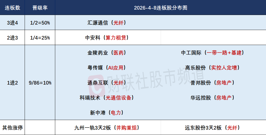 连板晋级率降至28.57%,市场短线情绪与指数继续呈现跷跷板,指数普涨的同时,3板及以上连板股家数降至2只,此前7连板的高标股津药药业津药药业早盘炸板回落收出长阴线,连板高度降至4连板的汇源通信,且该股最近3个涨停均以一字板完成。受到中东局势暂时降温提振,短线资金集中撤离油气、煤炭等能源线,科技成长赛道此消彼长下全面加强,AI软硬件以及半导体、燃气轮机等全面回暖的同时,贵金属为代表的有色板块也迎来全面回暖。随着今日普涨反弹修复,明日实现晋级的首板股所属方向至关重要,或决定短线热点的进一步发展。