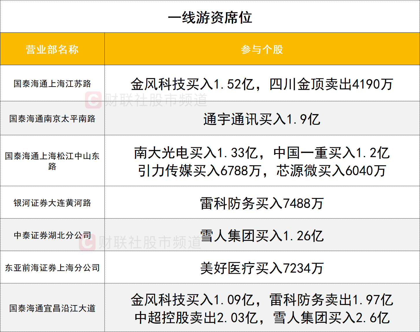 一线游资活跃度一般,金风科技获两家一线游资(国泰海通证券宜昌沿江大道、国泰海通证券上海江苏路)分别买入1.09亿、1.52亿。南大光电获一家一线游资(国泰海通证券上海中山东路)买入1.33亿。