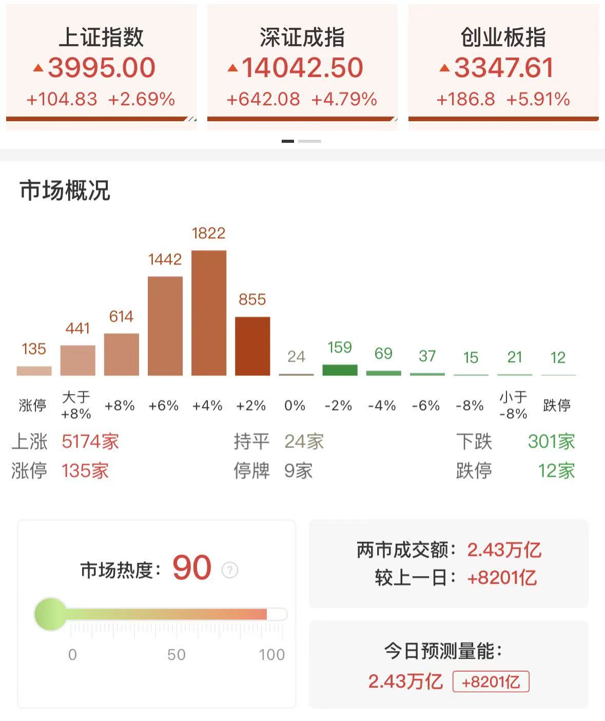 4月8日讯,市场集体反弹,沪指百点长阳,创业板指涨近6%、科创50指数涨超6%。量能明显放大,沪深两市成交额2.43万亿,较上一个交易日放量8201亿。盘面上,市场热点快速轮动,全市场超5100只个股上涨,其中135只个股涨停,连续两日超百股涨停。从板块来看,AI产业链集体爆发,其中算力租赁概念走强,大位科技、行云科技、奥瑞德、杭钢股份、华孚时尚涨停。算力硬件概念快速拉升,中际旭创涨超10%,刷新历史高点,铭普光磁、东山精密、沪电股份、深南电路等多股涨停。AI应用端表现活跃,十余只成分股涨停,蓝色光标20cm涨停,志晟信息30cm涨停。贵金属概念集体走高,湖南黄金、四川黄金、西部黄金涨停。下跌方面,油气概念集体调整,中曼石油、贝肯能源、蓝焰控股跌停。截至收盘,沪指涨2.7%,深成指涨4.79%,创业板指涨5.91%。
