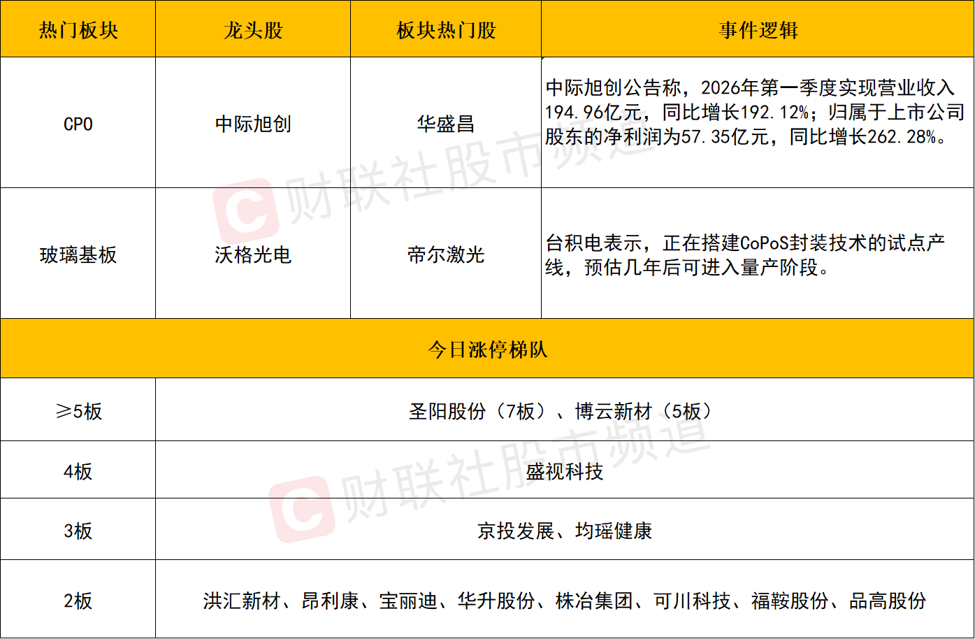 算力硬件方向延续强势,优迅股份、中瓷电子、华盛昌、可川科技、广合科技等涨停,源杰科技、光库科技、仕佳光子、新易盛、中际旭创等同样涨幅居前