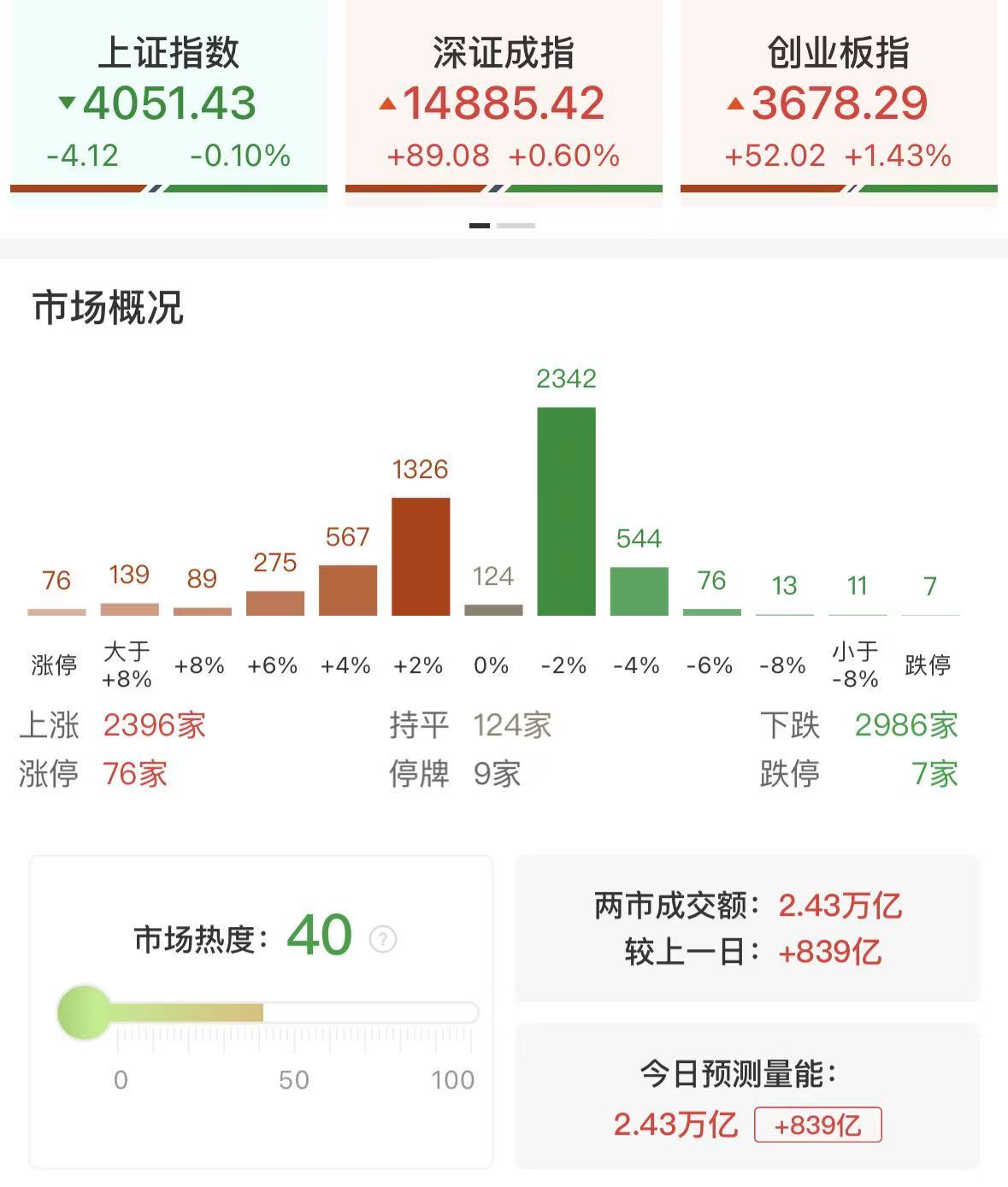 4月17日讯,三大指数涨跌不一,沪指窄幅震荡,创业板指涨超1%,再创近11年新高,北交所个股午后异动,北证50涨近5%。黄白线分化明显,权重股表现较强。沪深两市成交额2.43万亿,较上一个交易日放量839亿。盘面上,市场热点快速轮动,全市场近3000只个股下跌。从板块来看,算力产业链持续爆发,其中CPO概念反复活跃,十余只成分股涨停,剑桥科技、光迅科技涨停创历史新高,源杰科技股价超越茅台成A股新“股王”。PCB概念延续强势,广合科技涨停创历史新高。液冷服务器概念持续活跃,圣阳股份7连板,博杰股份、金富科技、康盛股份、海亮股份涨停。下跌方面,旅游酒店概念集体调整,桂林旅游、西安旅游、丽江旅游纷纷下挫。截至收盘,沪指跌0.1%,深成指涨0.6%,创业板指涨1.43%。