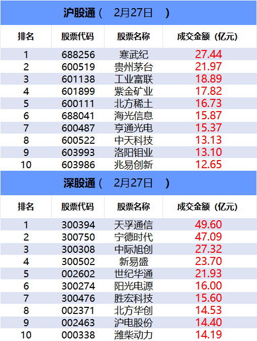 从沪股通前十大成交个股来看,寒武纪位居首位;贵州茅台和工业富联分居二、三位。