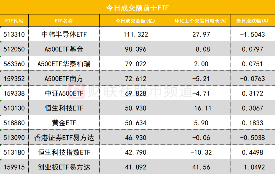 从成交额前十的ETF来看,中韩半导体ETF(513310)成交额位居首位,A500ETF基金(512050)成交额位居次席。