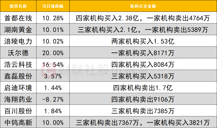 今日龙虎榜机构活跃度一般,算力租赁概念股首都在线获四家机构买入2.38亿,深股通买入2.28亿,同时遭一家机构卖出4764万。有色金属板块集体走强,湖南黄金获三家机构买入2.1亿,同时遭一家机构卖出5389万。