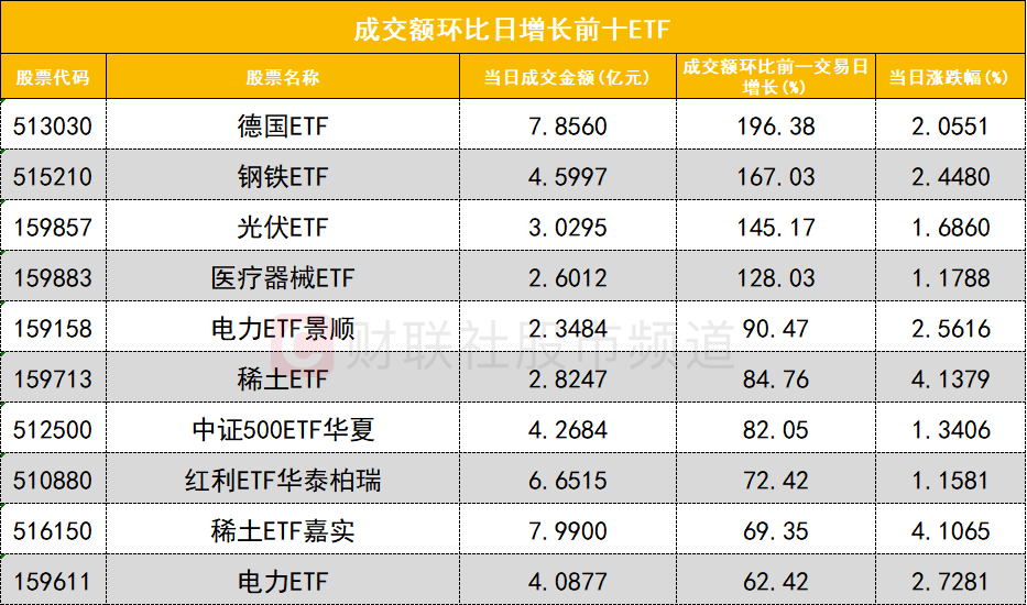 从成交额环比增长前十的ETF来看,德国ETF(513030)成交额环比增长196%位居首位;钢铁ETF(515210)成交额环比增长167%位居次席。