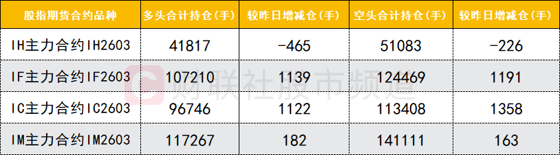 四大期指主力合约中,IF、IC、IM合约多空双方均加仓,IC合约空头加仓数量较多。