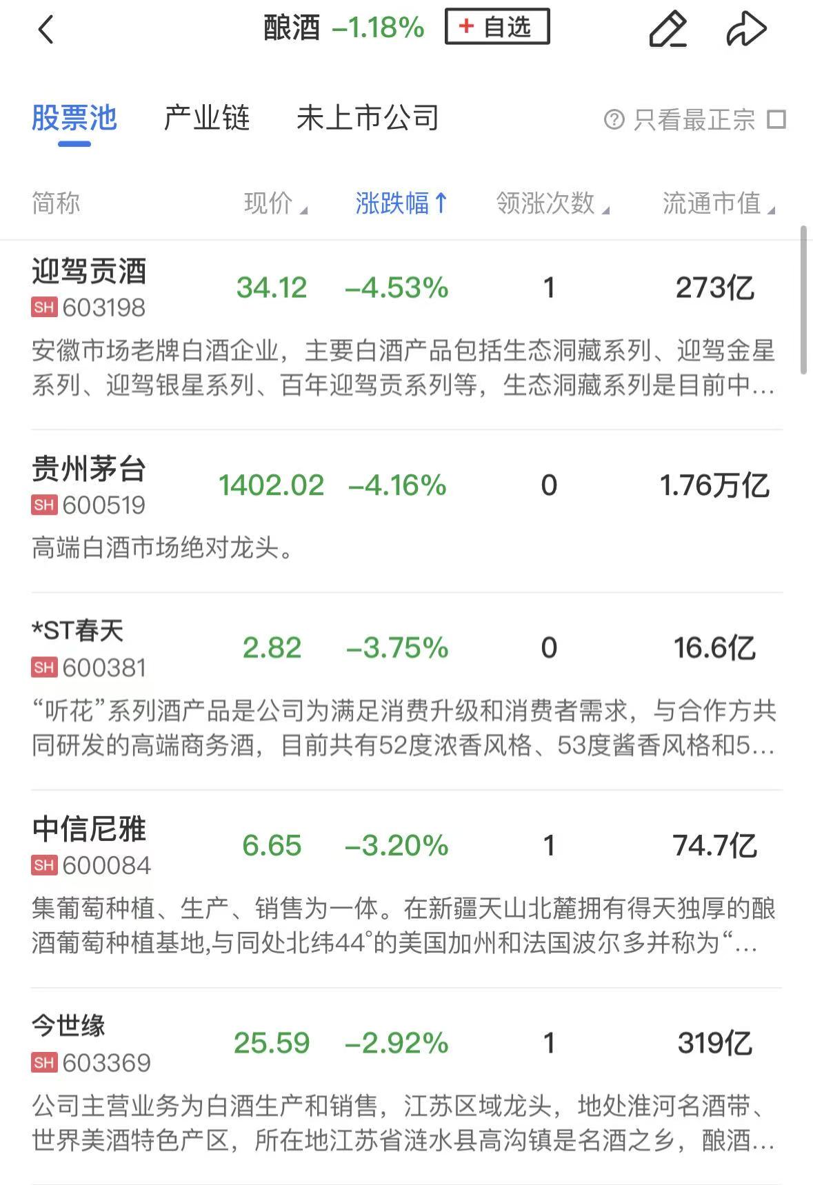 酿酒板块跌幅居前,贵州茅台跌超4%,迎驾贡酒、酒鬼酒今世缘、舍得酒业跟跌。消息面上,贵州茅台2025年实现营业收入1688.38亿元,同比下降1.21%;归母净利润823.2亿元,同比下降4.53%;基本每股收益65.66元。数据显示,2025年是贵州茅台上市以来首次出现营收、净利润双双下滑。
