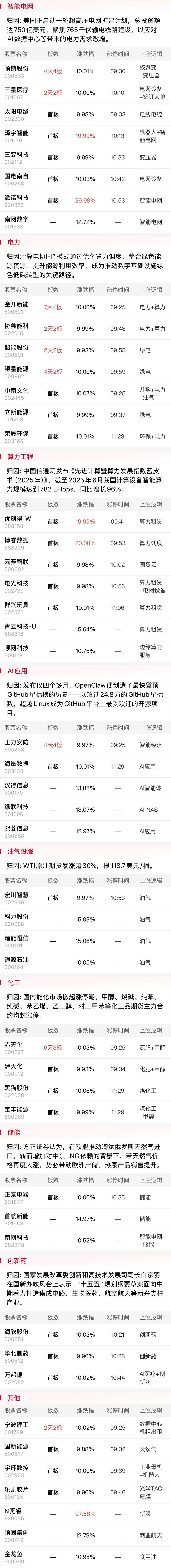 综合来看,今日早盘市场集体调整,受国际油价飙升的刺激,油气股逆势走强,中国海油再度走强,而备受市场关注的OpenClaw概念同样逆势拉升,另一方面,电网设备概念也延续近期强势。但除了上述几大板块以外,其余方向大多以调整为主,其中科技股遭遇重挫,CPO、半导体、消费电子等跌幅居前。整体而言,今日市场的下跌更多受到外围市场的影响,随着短线情绪集中释放后,预计后续市场重心或将回归A股本身节奏之中。