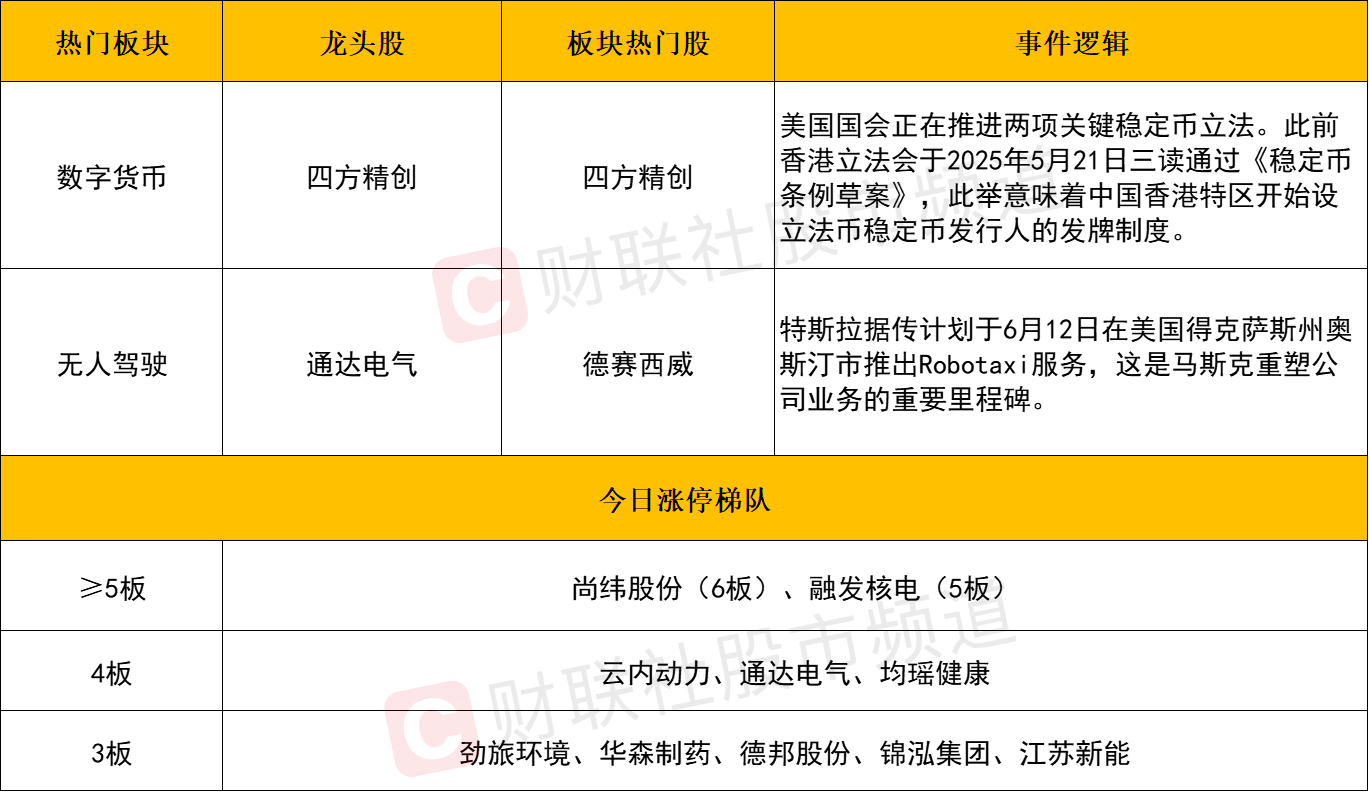 数字货币同样走强,拉卡拉、四方精创、雄帝科技、神州信息、海联金汇、京北方、御银股份、中科金财等个股涨停。消息面上,美国国会正在推进两项关键稳定币立法。此前香港立法会于2025年5月21日三读通过《稳定币条例草案》,此举意味着中国香港特区开始设立法币稳定币发行人的发牌制度。