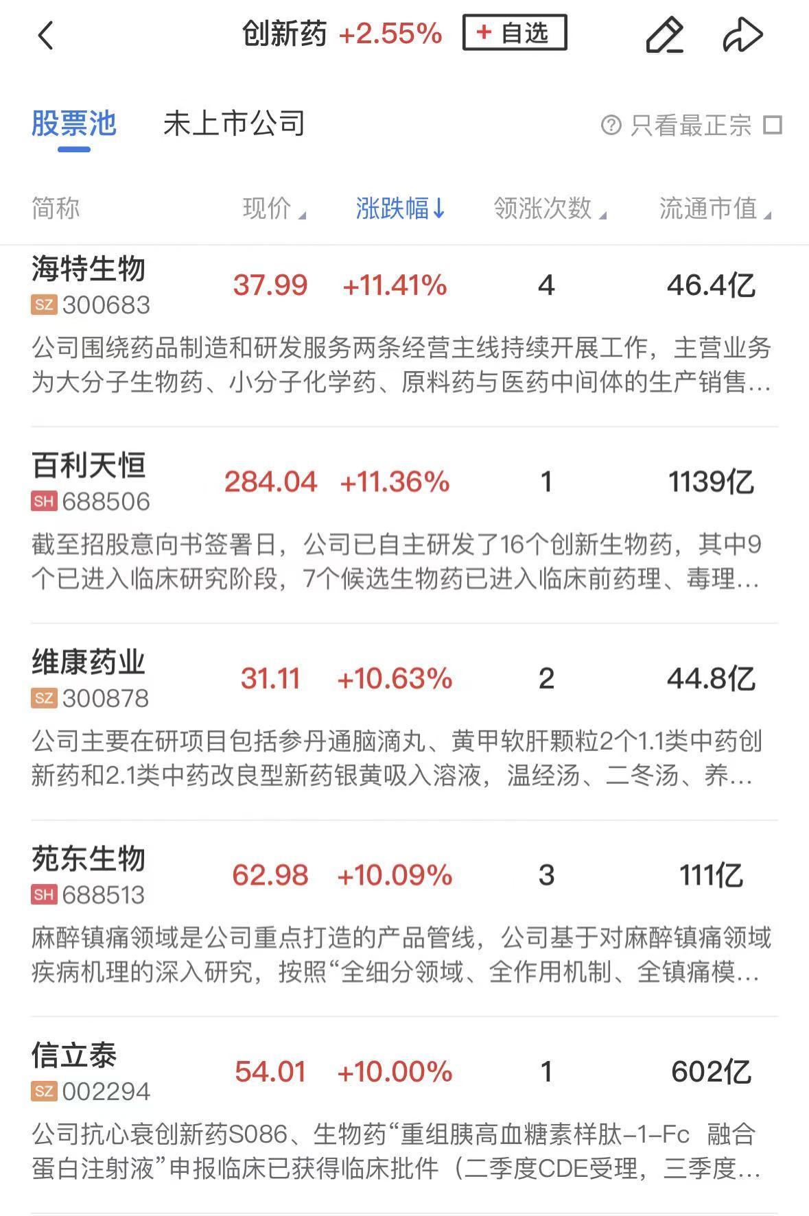 创新药方向再度活跃,信立泰涨停,海特生物、维康药业、百利天恒涨超10%,苑东生物、荣昌生物、海思科、科伦药业涨幅靠前。