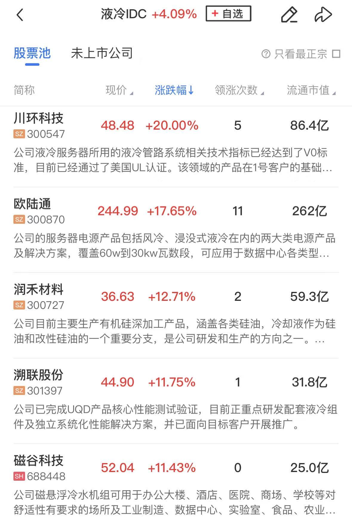 液冷服务器概念股再度爆发,川环科技、大元泵业、科士达、川润股份、集泰股份涨停,欧陆通、南方泵业、英维克等涨幅居前。