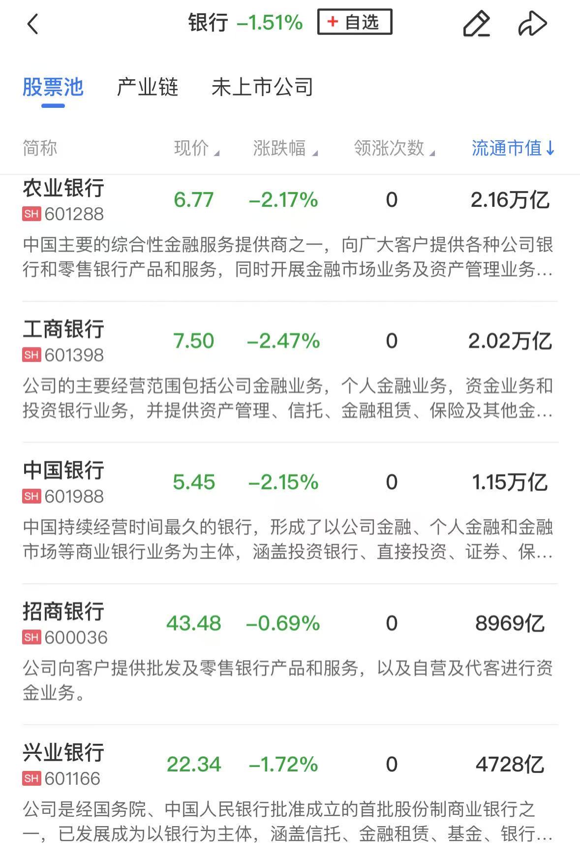 银行股展开调整,工商银行、农业银行、中国银行、建设银行、中信银行、民生银行等跌超2%。