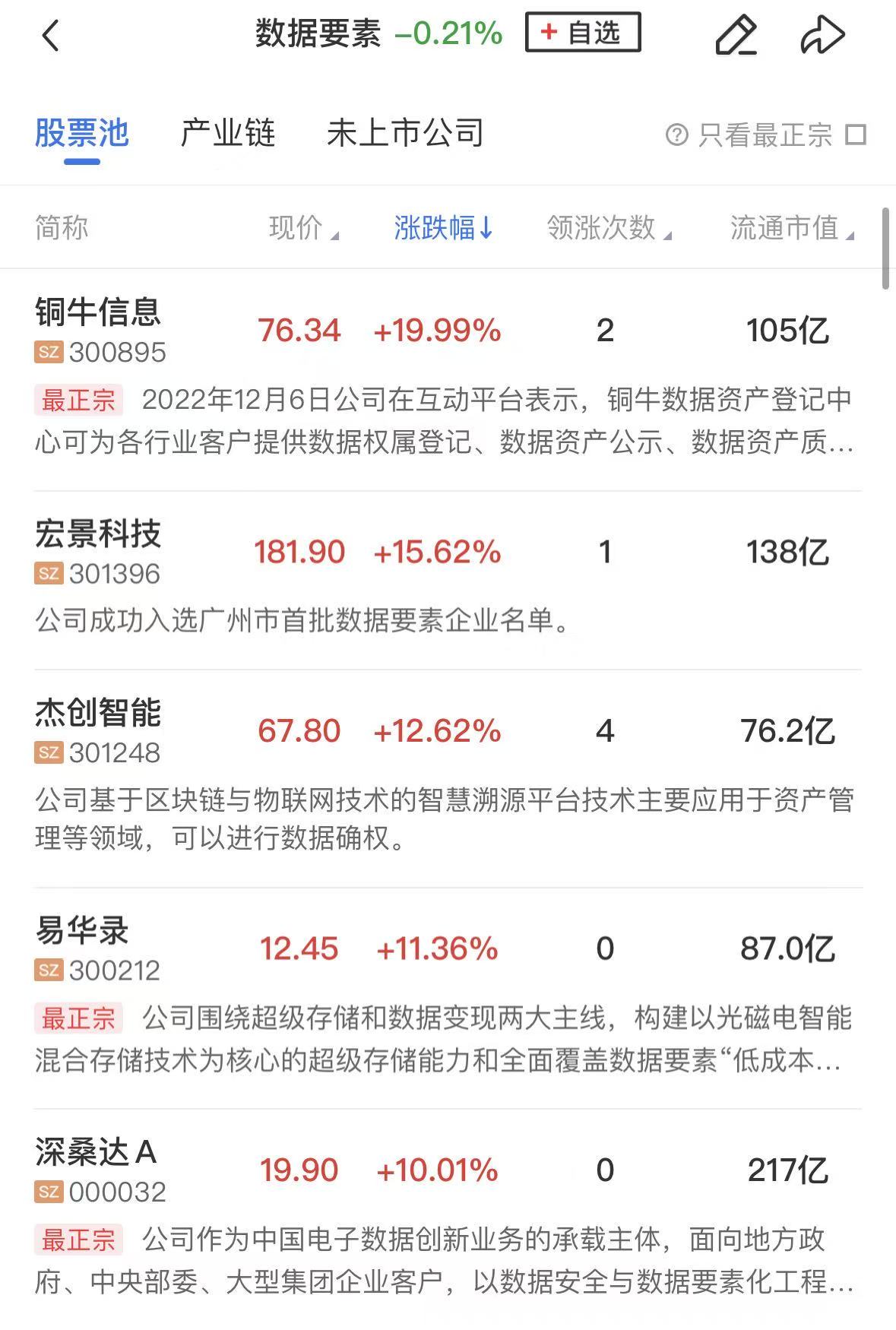 临近午盘,数据要素概念异动拉升,铜牛信息20CM涨停、易华录涨超10%,中国科传、深桑达A、果麦文化、中信出版、太极股份等跟涨。